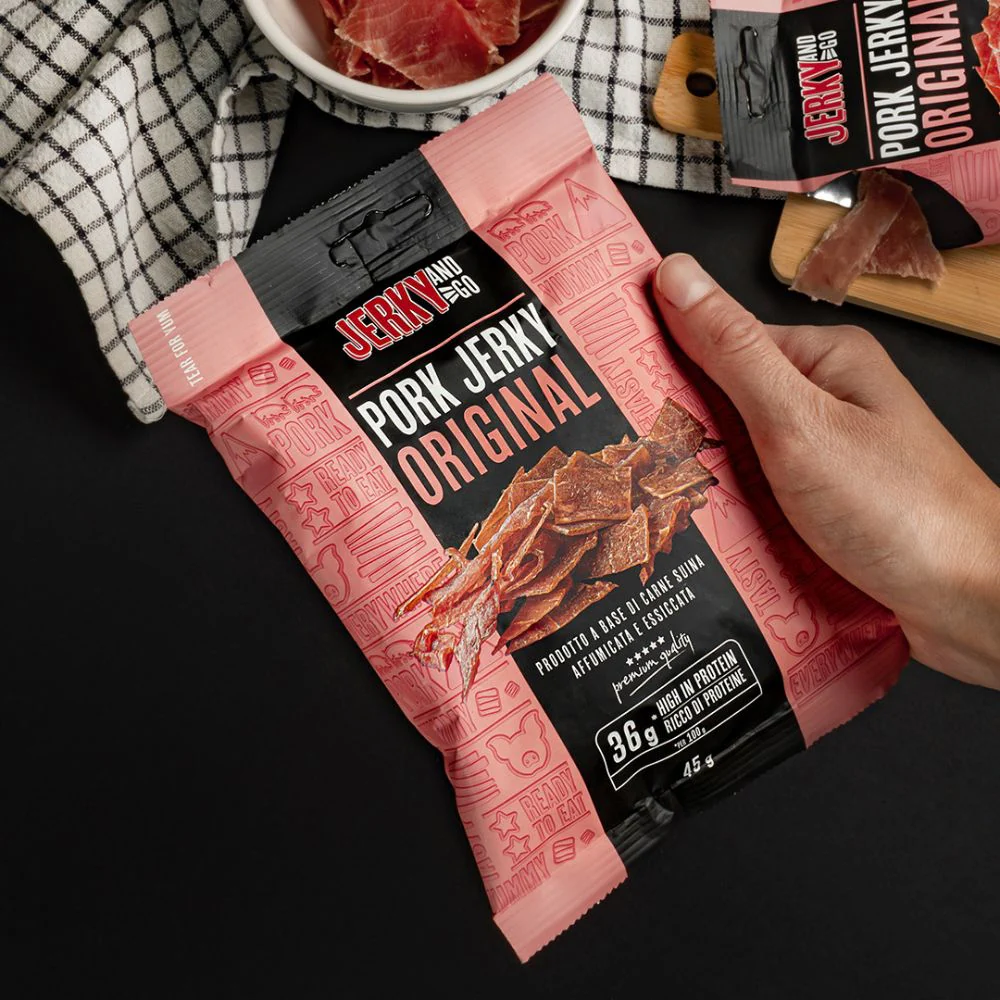 8 Jerky and Go Pork Jerky Original, 8 confezioni di carne secca di maiale da 45g
