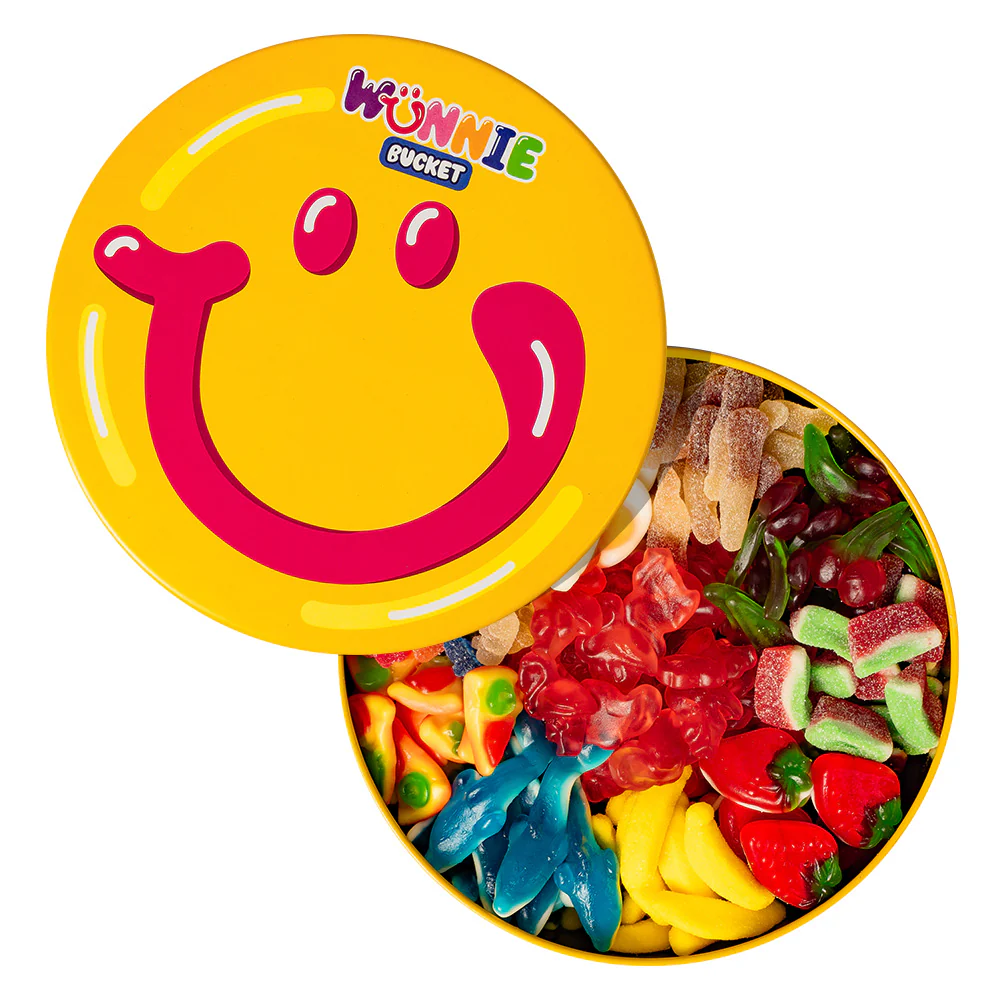 Wunnie Bucket è il paradiso in latta per tutti gli amanti delle caramelle: 2kg di puro godimento, un’esplosione di colori, profumi e sapori che conquisterà tutti. Fino a 10 gusti diversi tra caramelle frizzanti, aspre o morbide con colori, forme e sapori stravaganti: angurie, fragole di bosco, banane, delfini, pizze, orsetti frizzi, uova, coca cola, flamingo e ciliegie. I gusti potrebbero cambiare leggermente a seconda della disponibilità.